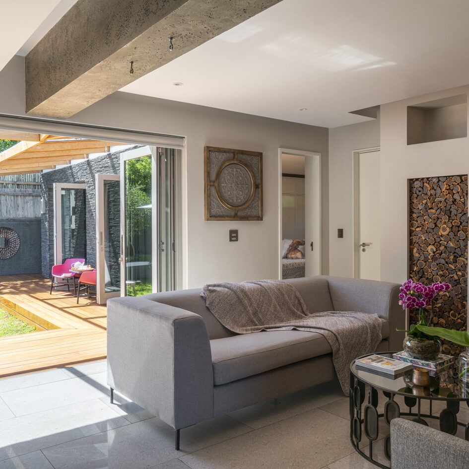 Custom made windows (security glas) and folding doors (floor to ceiling) create a seamless flow from dining area onto pool deck and into the back garden in summer, but a cozy and warm athmosphere in winter with stunning views and beautiful light all year. Large pool deck with windshielded sitting area,infinity pool (4×7 meters) and Jacuzzi. Weber Gas Grill and Braai-Area next to pool deck. The Appartment created in 2017 is a little gem having separate access, a fully equiped kitchen, a small separate terrasse providing additional privacy for 2 persons.